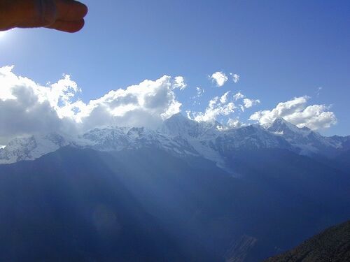 徳欽の街は谷間にあり、梅里雪山は全く見えない。 夕方の梅里雪山が見たい。 さっき来た道を5,6kmも戻れば梅里雪山が良く見える場所がある。 タクシーは、さっき来た道を更に前へ進む。 眼前に梅里雪山が全貌を現わす。 飛来寺、此処が梅里雪山を眺める…